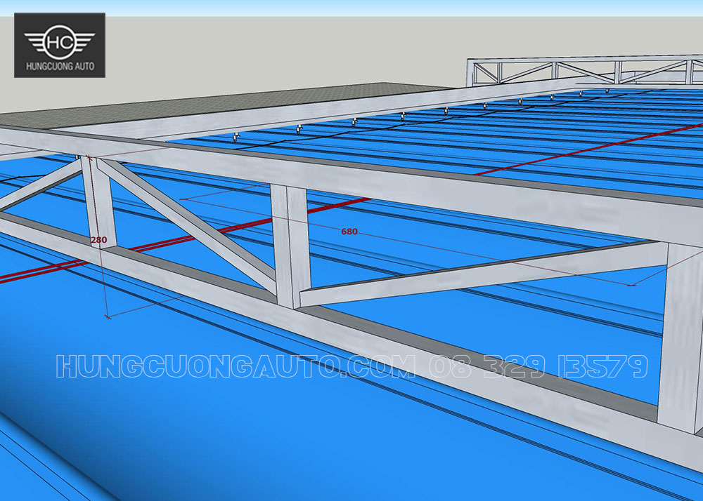 Hình ảnh phối cảnh 4D bản vẽ mái xếp 13.2m x6.8m sử dụng kèo kép và kèo đơn.