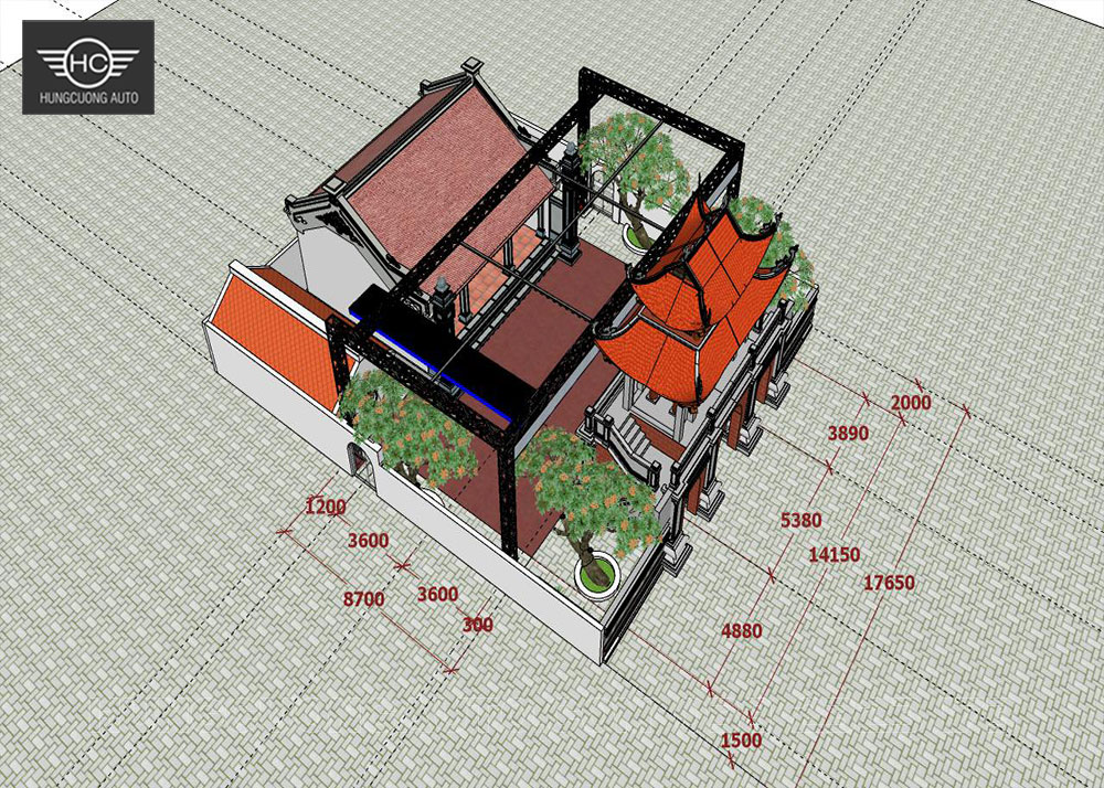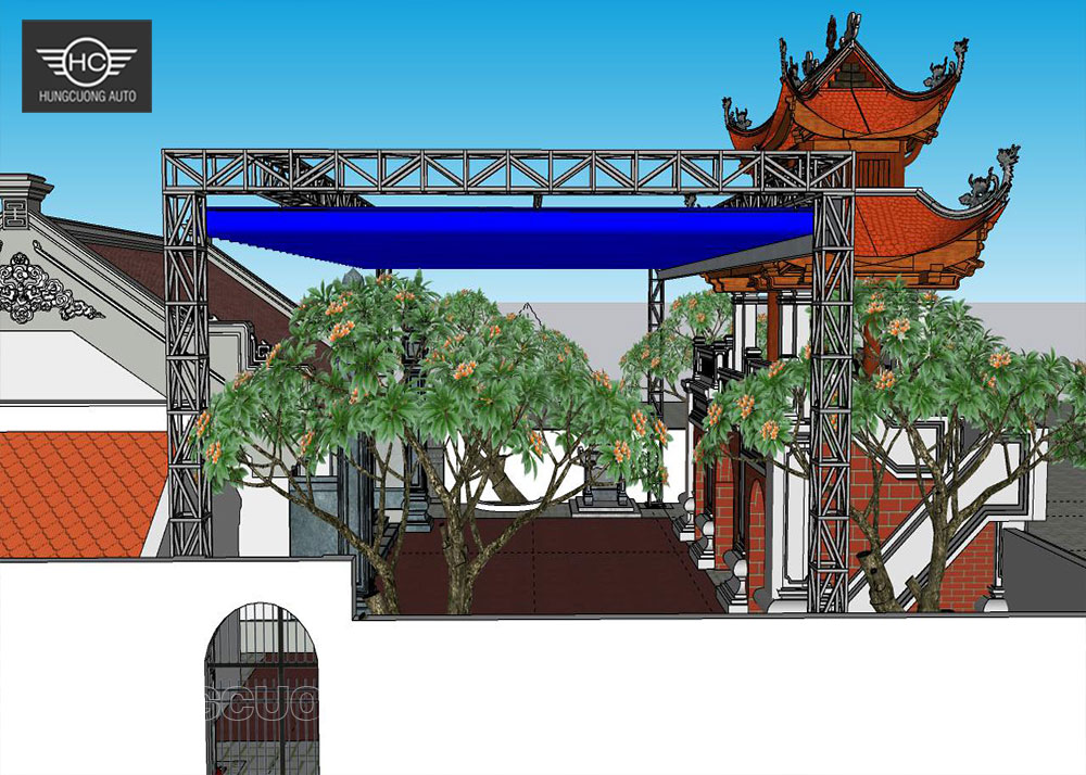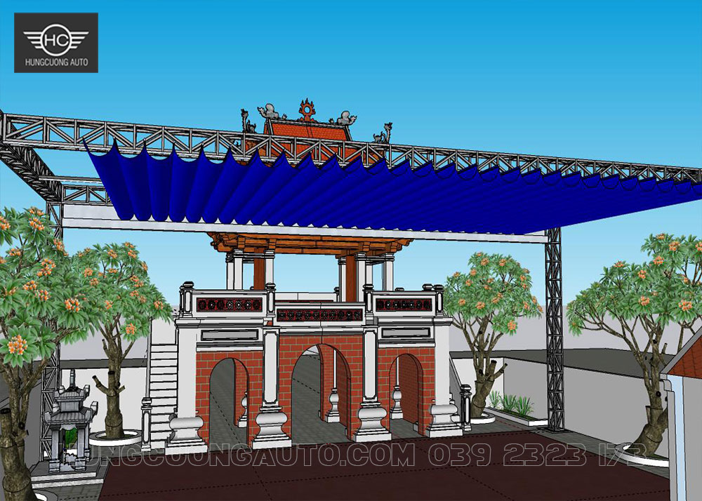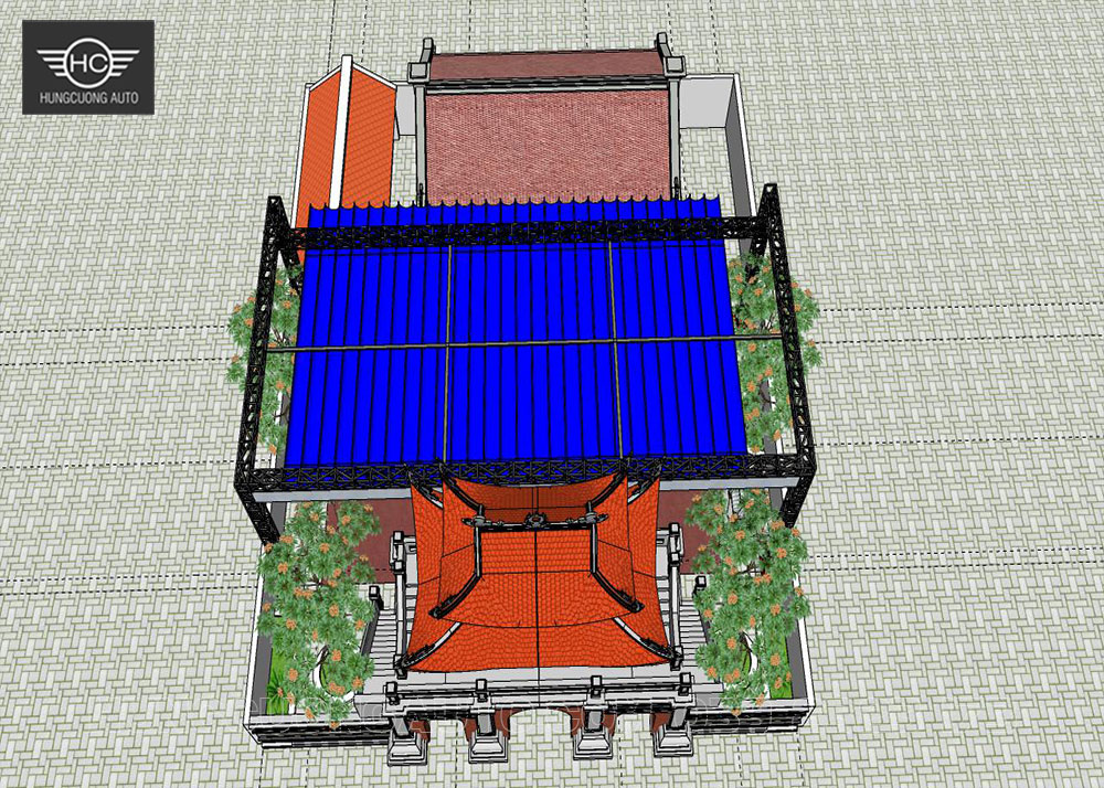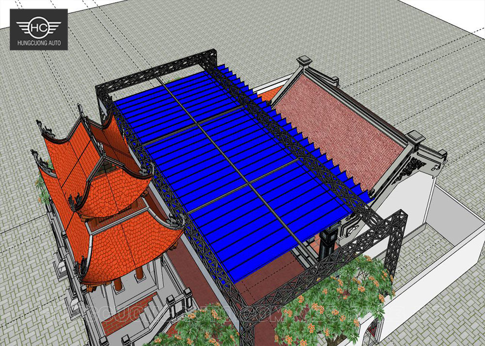 Mô tả dự án: Mái bạt xếp nhà chùa kích thước 17.65x8.7m.