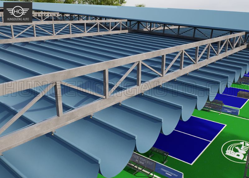 • Khung mái chính được lắp đặt chắc chắn lên các cột trụ. Hệ thống ray trượt được tích hợp vào khung mái với bánh xe chất lượng cao giúp mái bạt di động êm ái và dễ dàng. Độ chính xác của hệ thống ray trượt được kiểm tra cẩn thận để đảm bảo vận hành ổn định và mượt mà.