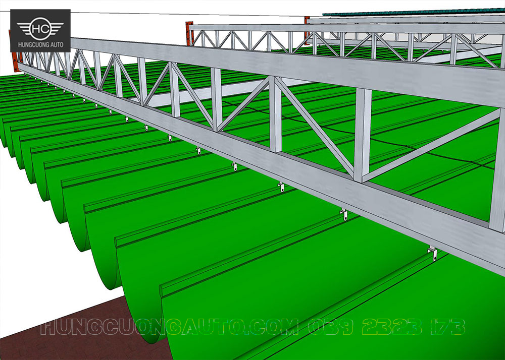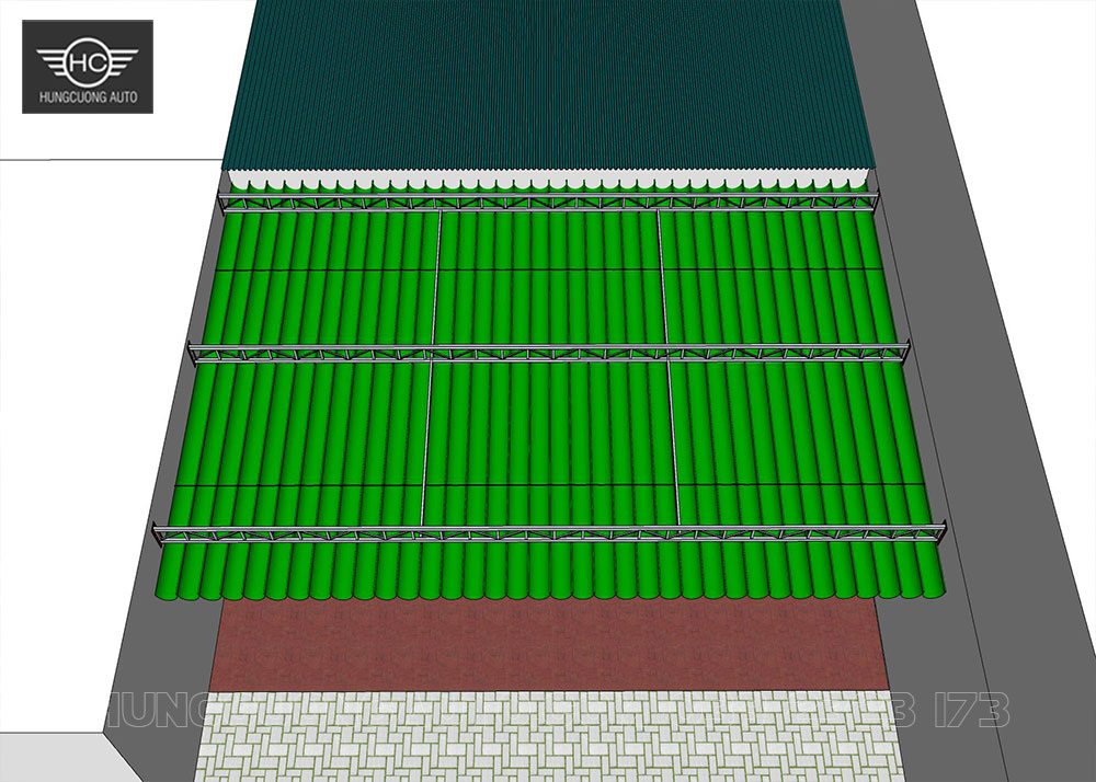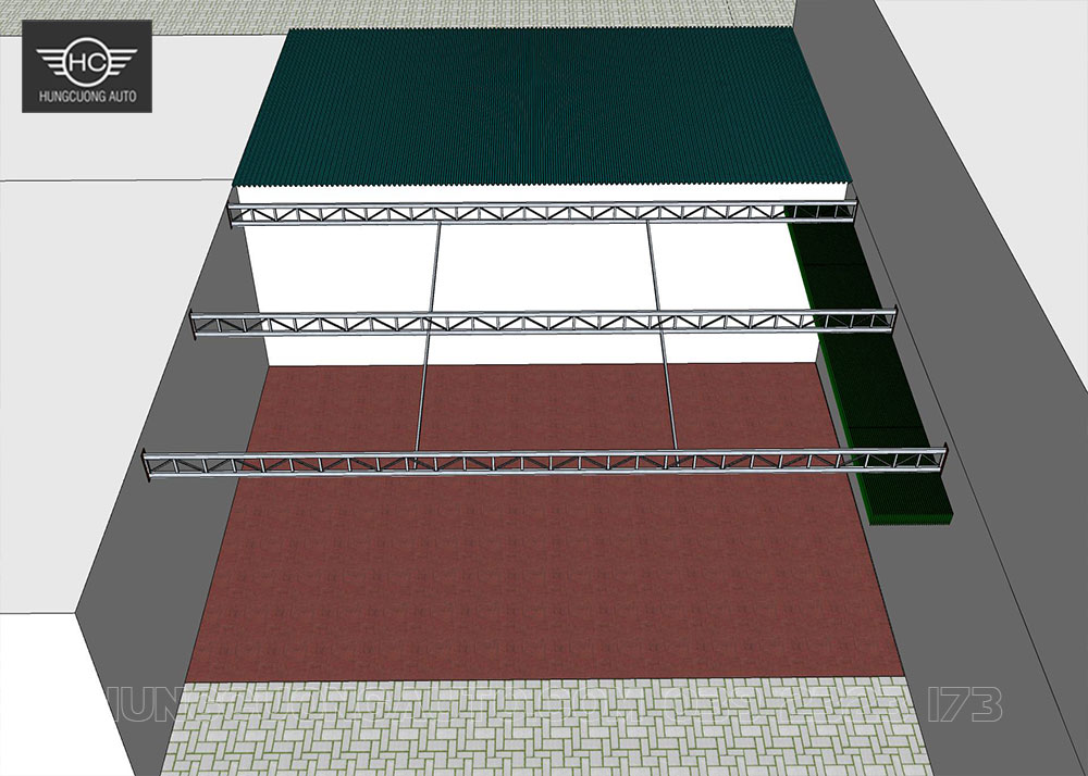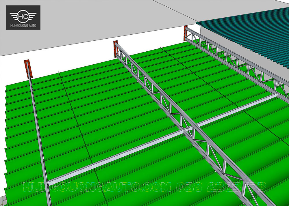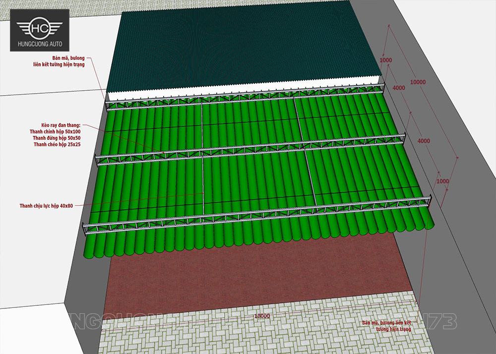 + Phần kèo ray:Kèo ray đan thang đơn thanh chính bằng hộp 50x100x1.4ly, thanh đứng bằng hộp 50x50x1.4ly, thanh chéo bằng hộp 25x25x1.0ly. Toàn bộ mái chia thành 3 đường ray, mỗi ray cách nhau 4m, và cách mép bạt là 1m. Phần kèo ray sẽ được bắt trực tiếp vào tường của nhà hiện trạng bằng bản mã và bulong tạo một hệ kết cấu vững chắc.