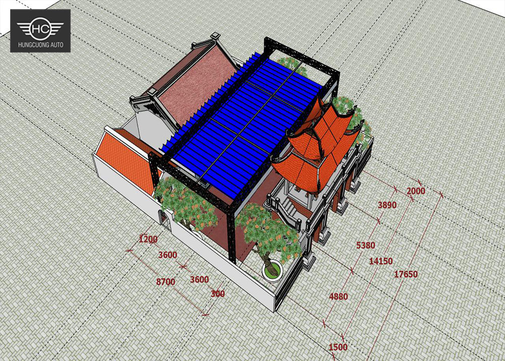 Mô tả dự án: Mái bạt xếp nhà chùa kích thước 17.65x8.7m.