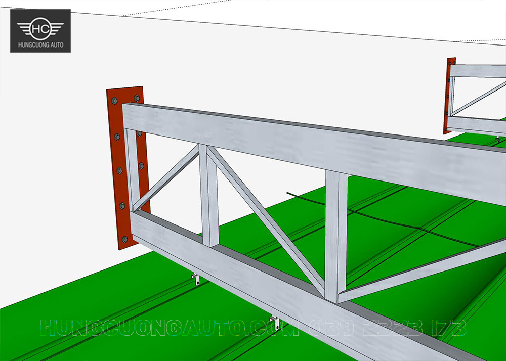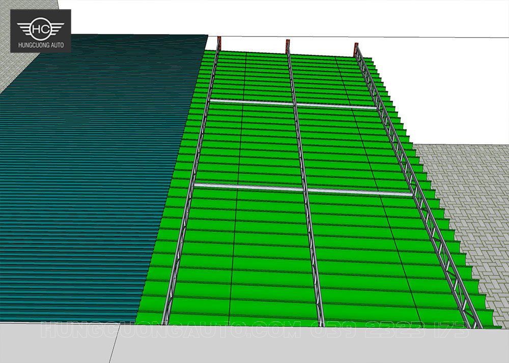 + Phần kèo ray:Kèo ray đan thang đơn thanh chính bằng hộp 50x100x1.4ly, thanh đứng bằng hộp 50x50x1.4ly, thanh chéo bằng hộp 25x25x1.0ly. Toàn bộ mái chia thành 3 đường ray, mỗi ray cách nhau 4m, và cách mép bạt là 1m. Phần kèo ray sẽ được bắt trực tiếp vào tường của nhà hiện trạng bằng bản mã và bulong tạo một hệ kết cấu vững chắc.